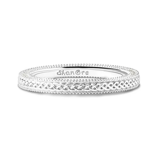 Shanore's 14k White Gold Lab Grown Diamond Celtic Trinity Knot Wedding Ring blends modern esthetics with Irish heritage. This 14K white gold band features Celtic knotwork, milgrain edging and lab-grown diamonds. The Celtic knotwork pattern covers the band's surface. Glittering white lab-grown diamonds embellish the sidewalls. Milgrain borders add more charm to the ring. The endless Celtic knotwork portrays eternal bonds between a married couple. White gold links to purity and loyalty. Ethically sourced lab-grown diamonds appeal to the socially- conscious buyer. Add this wedding band to your store’s stocks to give your buyers new-age jewelry options that still honor the tradition. We also stock a matching solitaire engagement ring to sell as a set. Comes Presentation Boxed.