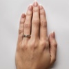 This stunning Shanore Celtic Trinity Knot Wedding Band is pave set with glistening diamonds and emerald stones. Displaying an intricately crafted trinity knot design, the band leads up to a cluster of diamonds, with a centered emerald. The classic Celtic symbolism ties this modern ring into a cohesive piece.