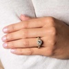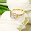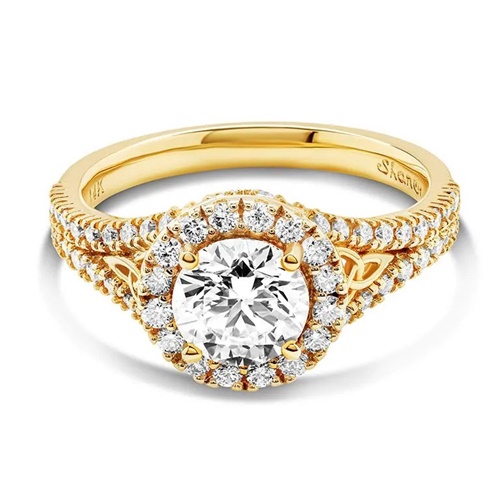 Shanore's 14K Yellow Gold Round Halo Celtic Trinity Knot Engagement Ring with 2ct center Lab Grown Diamond is a glorious piece. Its halo and solitaire design incorporates subtle Celtic motifs. The star feature is a glittering 2ct diamond in the round brilliant cut. A halo of smaller white diamonds encircles the central gemstone. Further, the ring mount has split shanks lined with more diamonds. Two Celtic trinity knots sit between the split shanks on either side. All the diamonds in this ring are lab-grown, ethically sourced and carefully selected for perfect shine. The Celtic trinity knot signifies life, death and rebirth. The solitaire diamond proclaims a love that’s forever. Yellow gold reveals precious bonds. Lab-grown diamonds indicate the wearer’s ecological awareness. Add this ring to your store’s inventory for buyers looking for greener alternatives. You can also order a matching wedding ring to sell as a set. Comes Presentation Boxed.