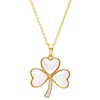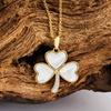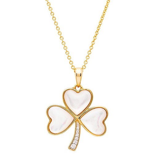 The 14KT Gold Vermeil Shamrock Necklace Studded with White Cubic Zirconias. A slightly curvy stalk in plain gold contrasts charmingly with the three diamond-studded leaves and gives harmony to the piece. The shamrock is the Irish emblem signifying good wishes and blessings. Wear this pendant and it will be like carrying your good luck on your person. We also offer plain gold chains and matching stud earrings to go with this pendant.