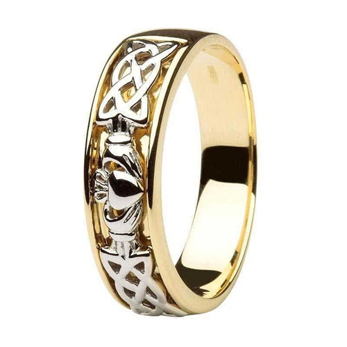 This exquisite hand-crafted Claddagh / Celtic wedding ring in 14 karat Yellow and White gold is the perfect choice for any Celtic bride and groom. The shimmering gold ring emits generous light and beauty, reflecting the inner compassion of lovers.