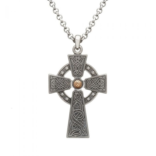 This meaningful antiqued sterling silver warrior pendant makes a beautiful Irish gift. The Celtic cross is an important symbol of the deeply rooted Catholic faith in Ireland. This Celtic cross is rendered in a stunning heavy sterling silver with a 18K gold beading in the center. It comes on a 26” Italian made Rollo Chain that is sturdy and long lasting.