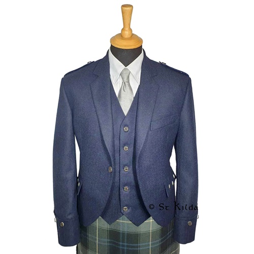 A beautifully tailored Elgin Blue Tweed Jacket with the option of adding a matching waistcoat. The Argyll is a traditional one-button fastening kilt jacket with gauntlet cuffs and scalloped pockets. It is the standard day-wear kilt jacket and is suitable for a variety of semi formal or formal occasions. This iconic jacket has been the gold standard in Highland wear since the nineteenth century. The Traditional Argyll Jacket can be worn with or without a 5 button vest and is usually accompanied with a belt and buckle set when a waist coat is not worn. The tweed variant is especially well-suited for semi-formal or casual occasions. All of our tweed jackets are made from pure wool to give a luxurious feel.
