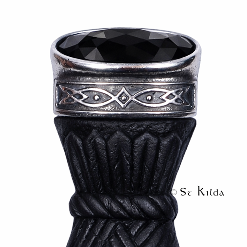 Celtic Sgian Dubh Dress with Black Stone Top is a traditional kilt accessory designed to add an elegant finishing touch to formal Highland attire. Crafted from durable resin with polished chrome accents, it features a decorative black stone top that enhances its refined appearance. The detailed metalwork highlights classic Celtic design elements, offering both heritage character and modern durability. Worn tucked into the kilt hose, this dress sgian dubh serves as a stylish accent piece that complements any formal Scottish outfit.