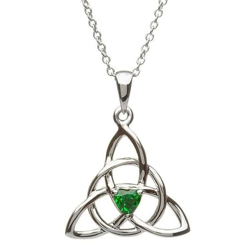 The pendant was designed around the Emerald Isles. The green heart shaped cubic zurconia emerald like stone reflects the shamrocks and wild grass that flows along the hills of Ireland. The stone is cradled within the Trinity Knot and Celtic Circle of the Sun. This ancient emblem represents the past, present and future,and that the sun will rise everyday. No beginning, no end.. The trio is bound by a single silver hoop, which weaves between the three and holds them tight together.