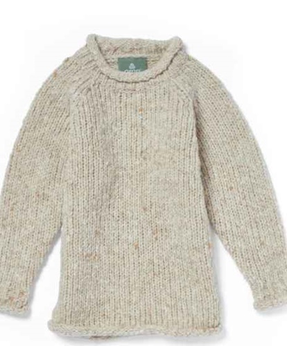 Featuring a mirrored cable at the crew neck making an attractive scalloped edge. Chunky wide elongated mirror cables form the central panel, flanked by chunky rope cables and 2 x 2 moss stitch. With raglan sleeves and a rolled hem. Standard fit and standard length. Aran stitches feature on the front, back and sleeves. Made in our own factory in Ireland in luxurious 5 gauge Supersoft Merino.