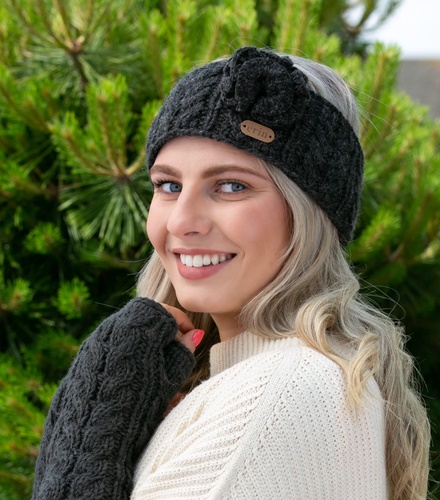 Aran Cable Knitted Headband in Charcoal color 100% Wool with Polyester fleece lining for extra warmth and comfort.