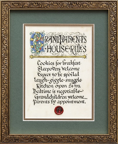 It is stated on print "Cookies for breakfast. Sleepovers welcome. Expect to be spoiled. Laugh-giggle-snuggle. Kitchen open 24 hrs. Bedtime is negotiable. Grandchildren welcome. . . Parents by appointment."
