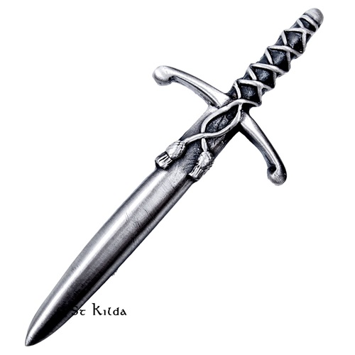 A laced short sword, a popular type of sword in late medieval Scotland, especially among the middle status Clansmen of the Highlands. This features the distinctively Scottish style of having the cross guard facing forward. The laces added to the decoration and took the form of little thistles. This was a popular way of presenting old swords in the Victorian period, and so became a classic style of kilt pin, hence the inclusion in our Swords of Scotland range. A Fusion of Elegance and Warrior Spirit! Premium quality pewter kilt pin finished in antique silver. Cast and finished in Glasgow, Scotland. Beyond its aesthetic appeal, this kilt pin serves a practical purpose as well. It adds weight to your kilt, preventing it from swaying in the wind and maintaining your dignified look. Its dual functionality makes it an essential accessory for Highland events, formal occasions, or whenever you wish to display your Scottish heritage with flair..