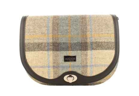 Mucros Weavers made this from 100% wool with nylon lining on the inside. The interior of this bag has both a zippered and two open compartments. The bag also features a detatchable leather strap and tassle accent.