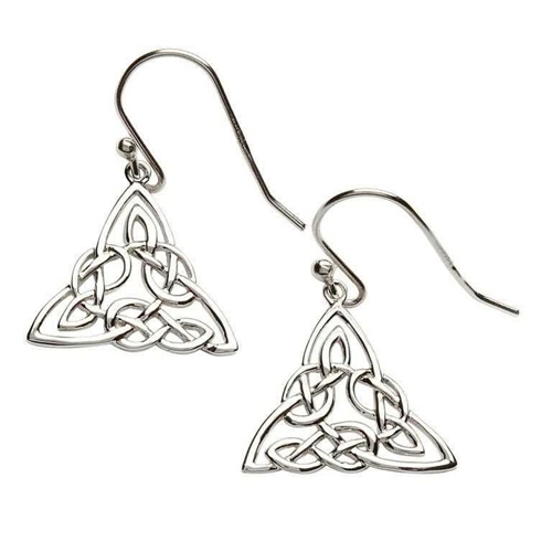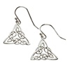 These retro sterling silver earrings present a beautiful Celtic design pattern displaying a collection of the traditional Triquetra symbols in a meticulously crafted manner. The Triquetra is formed of several Triquetra's interlaced within each other, with the top most tip forming a loop for the earring attacher.
