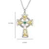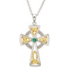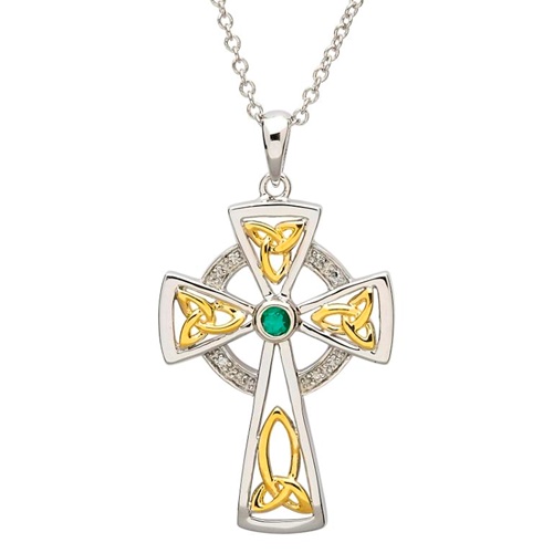 Sterling Silver Celtic Cross with Gold Plate Trinity Knot detail. This beautiful design features Pave Set Diamonds in the Circle and a brilliant Emerald in the center.