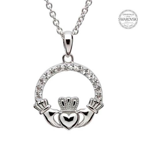A gorgeous and meaningful statement, this pendant features the Claddagh symbol bearing two hands encasing a heart that is adorned with a crown, and a sterling silver circle that is embellished with Swarovski® crystals.