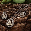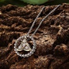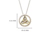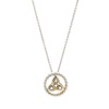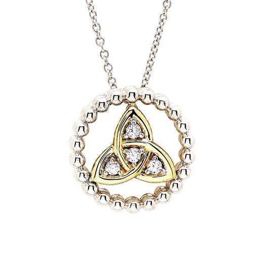 Shanore’s Sterling Silver White CZ Trinity Knot Necklace with 1M Gold Plated Detail is a splendid accessory. This necklace is in sterling silver with white cubic zirconia and yellow gold plated details. Its chain is 18" long with a spring ring catch. The bail-free pendant has a circular outline in the beaded ball style. A golden Celtic trinity knot with four cubic zirconia stones sits within the circle. A 1m thick gold plating ensures that the golden details of the pendant stay sharp for years. The Celtic trinity knot is the ancient Irish symbol for life, death and rebirth. The white cubic zirconia stones indicate serenity and calmness. Keep this gorgeous necklace in your store for buyers looking for authentic Irish jewelry. Comes Presentation Boxed.