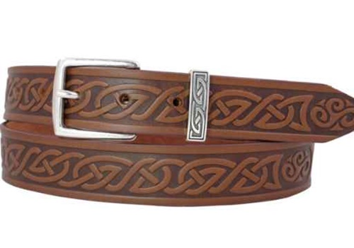 It has a Celtic Knotwork design. 1.25" embossed belt with a silvertone brass buckle.